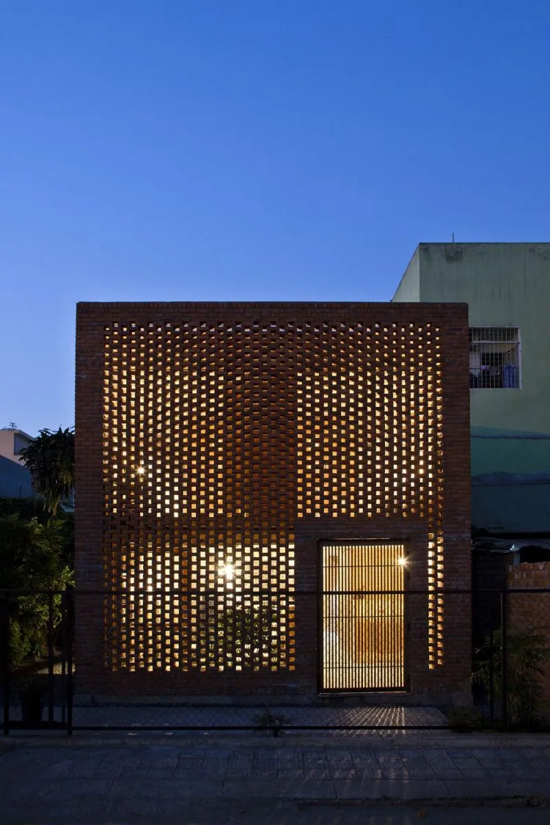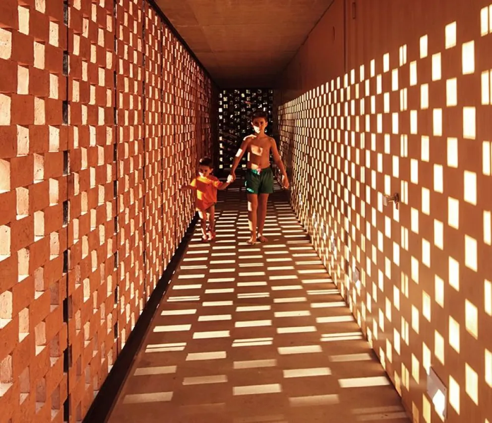 Los paños de celosías de ladrillo generan un juego de luces y sombras que enriquece el recorrido espacial en el interior. La hoja exterior de ladrillo ejerce de filtro solar para el cerramiento interior de vidrio, con lo que se crea una cámara que sirve para amortiguar las temperaturas extremas. La celosía permite el paso de la luz, la brisa y crea diferentes atmosferas y matices lumínicos a lo largo del día.