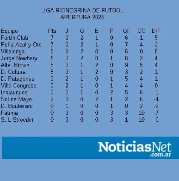 Este domingo se completó, parcialmente la tercera fecha del Torneo Apertura de la Liga Rionegrina de Fútbol y hay dos líderes, es que Fortín Club que empató esta tarde y Peña que sumó de a tres se posicionan en lo más alto del campeonato. La fecha comenzó el jueves con goleada de Jorge Newbery ante Sol de Mayo y queda pendiente el partido entre Boulevard y Villa Congreso que se pasó para el 1° de mayo por el mal estado del campo de juego tras el fuerte temporal de la semana pasada.