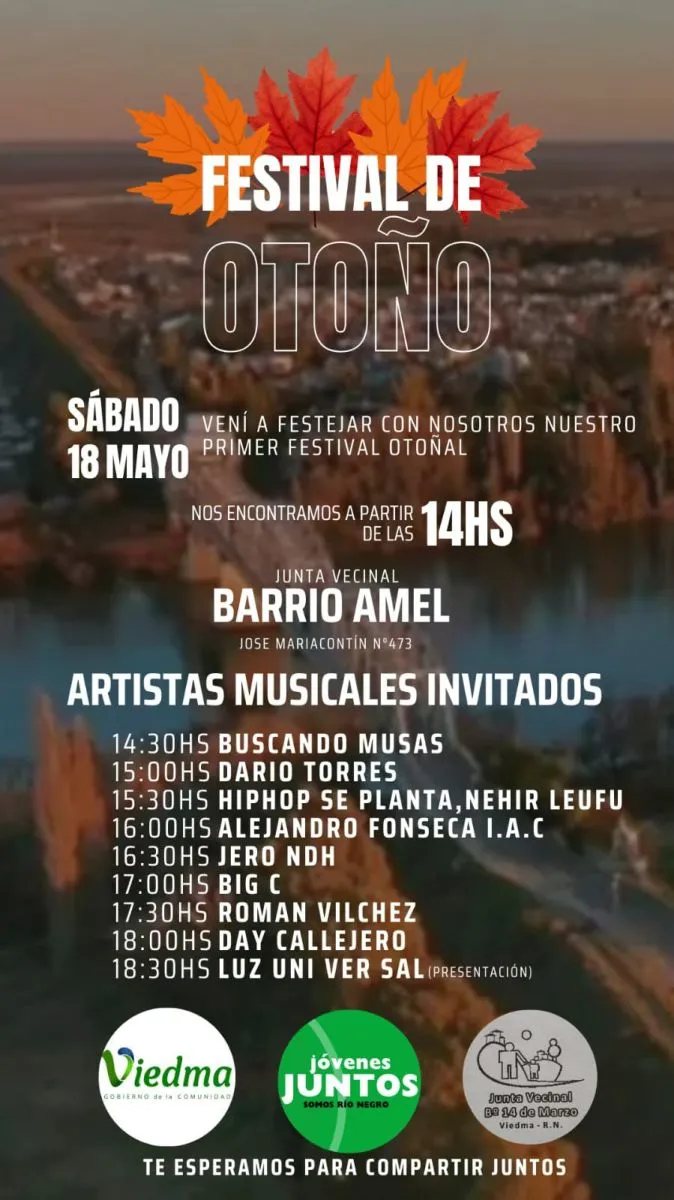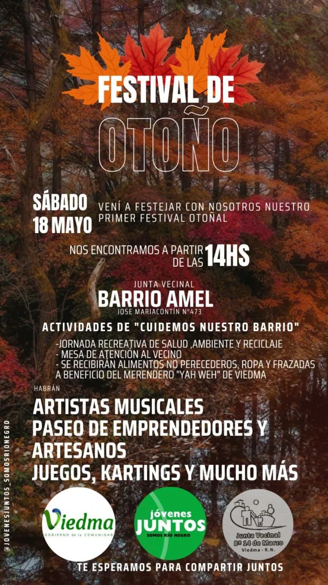 El sábado 18 de mayo, de 14:00 a 18:30, se llevará a cabo el primer festival en el barrio 14 de Marzo, conocido como Amel. La actividad está organizada por la agrupación Jóvenes Juntos Somos Río Negro, en conjunto con la Junta Vecinal y con el apoyo de la Municipalidad de Viedma.