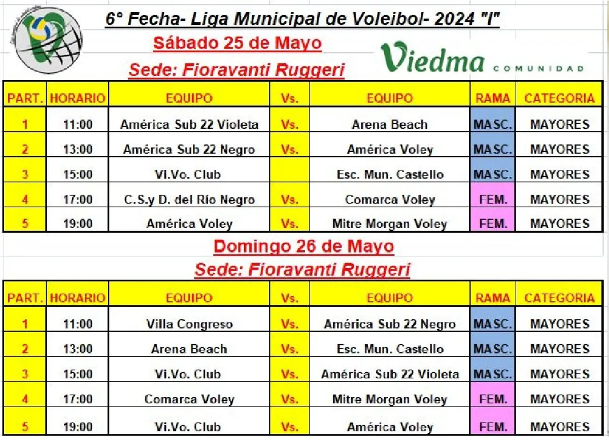 Este sábado 25 y domingo 26 de mayo se jugará la sexta fecha de la Liga Municipal de Vóley en el Gimnasio Municipal Fioravanti Ruggeri. Serán cinco los juegos por jornada que darán continuidad a un torneo que lidera América Vóley en la rama masculina y Vi. Vo. Club en la femenina.