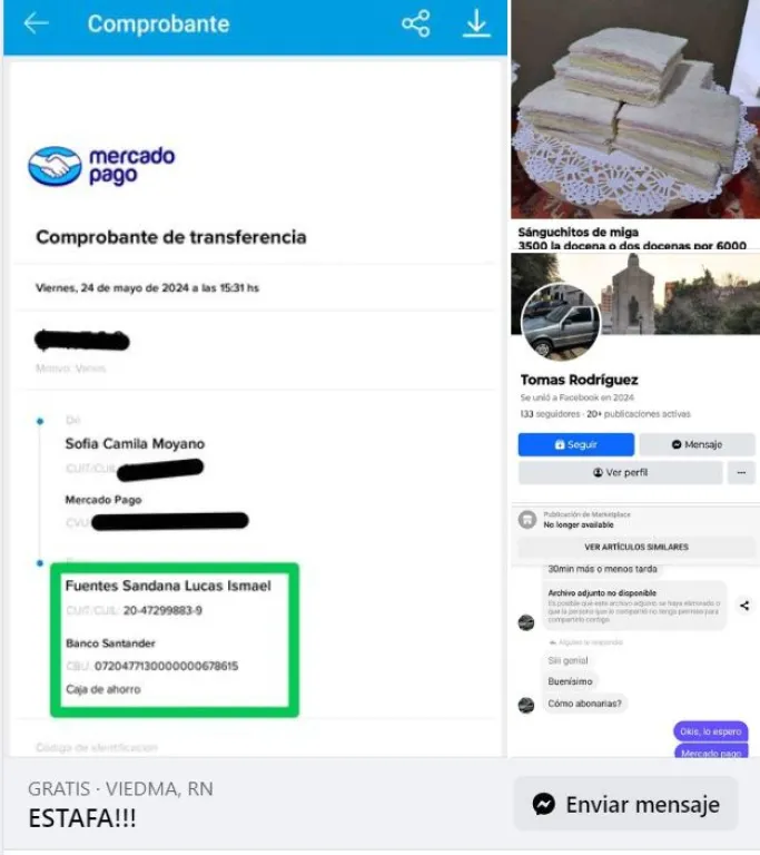 Mucha gente vende comida, viandas, ropa, distintos artículos a través de redes sociales, y no falta el que compra sin saber quién está del otro lado. Esto generando que muchos se hagan pasar por vendedores, utilizan esa distracción como señuelo, perjudicando a los que actúan de buena fe.