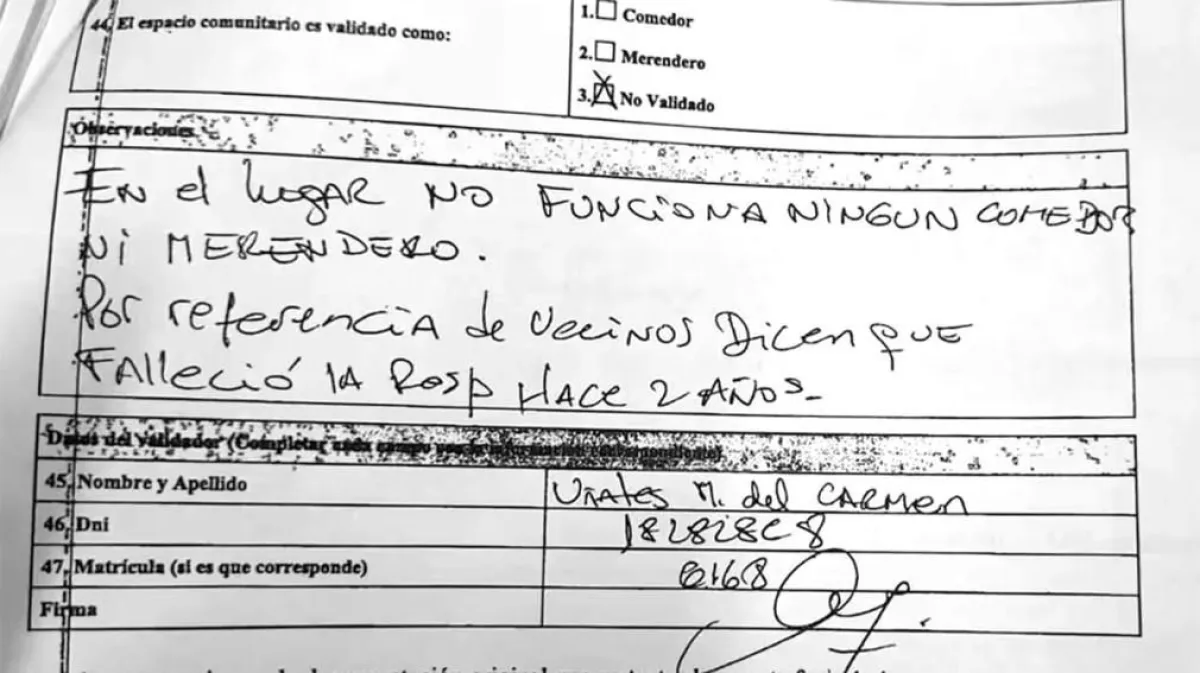 La documentación presentada ante la Justicia revela distintas observaciones realizadas durante las inspecciones. En algunos casos se menciona que en la dirección visitada no funciona ningún comedor ni merendero, y según los vecinos, la supuesta responsable falleció hace dos años. En otros casos, se constata que los lugares no funcionan más como comedores o merenderos, e incluso los domicilios declarados no coinciden con la realidad.