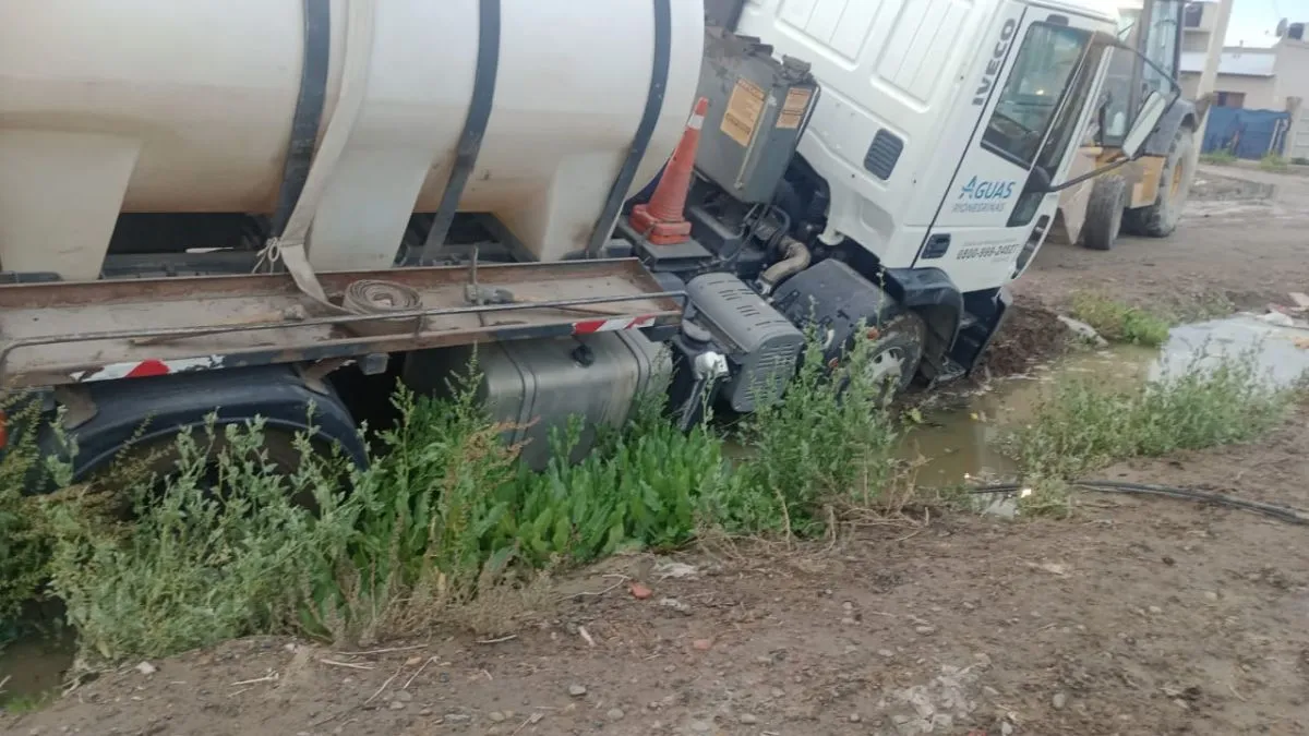 El camión de Aguas Rionegrinas quedó atrapado en el barro y tuvo que ser rescatado