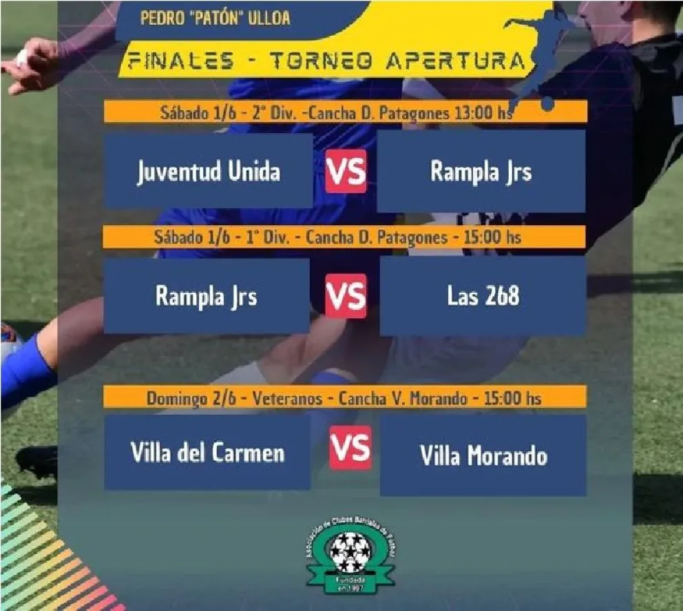 Este sábado 1° de junio, en el estadio del Deportivo Patagones, se desarrollarán las finales de Primera y Segunda División de la Asociación de Clubes Barriales de Fútbol de Patagones. Con gran expectativa, este fin de semana terminará el primer campeonato del año y se espera un importante colorido.