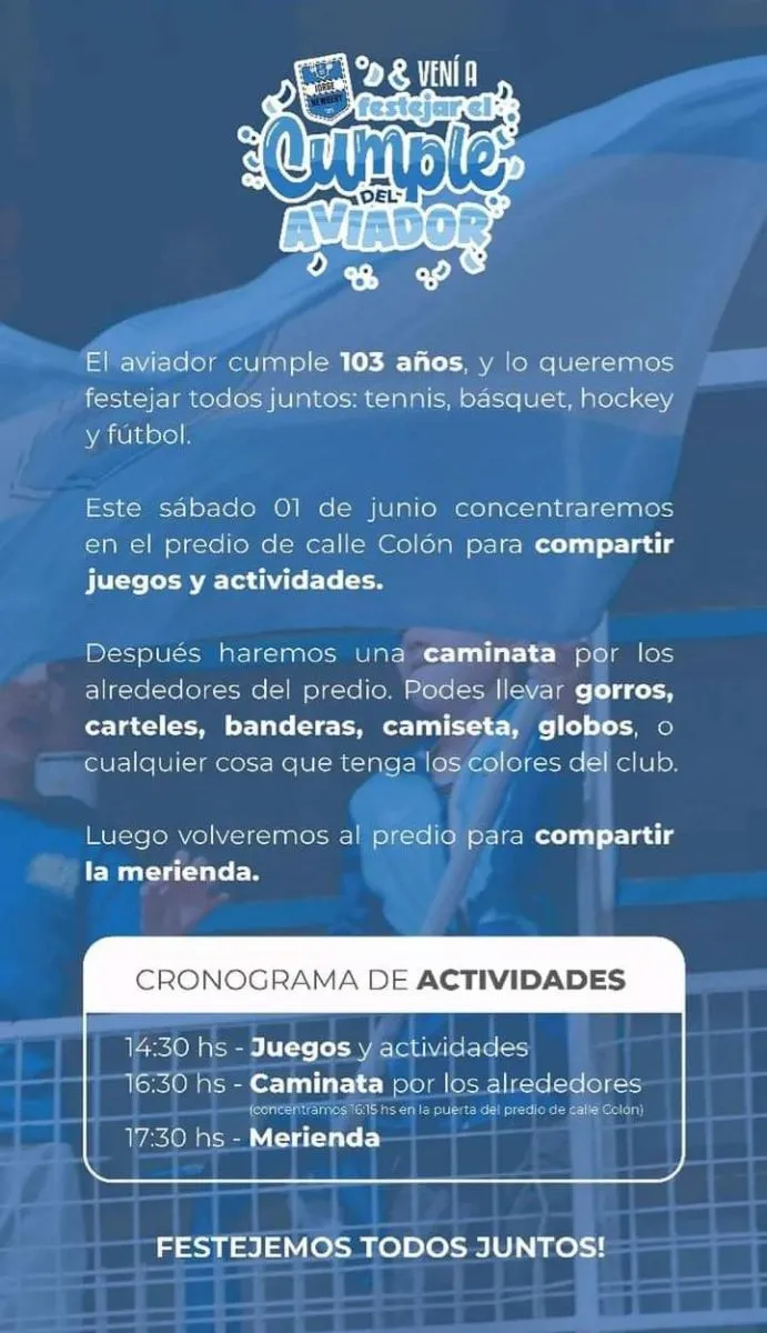 Este sábado 1° de junio, Jorge Newbery prepara una jornada destinada a toda la familia del club para conmemorar sus 103 años. El Aviador, de un presente institucional más que positivo quiere convocar a toda la familia del club para estar presente en un día tan especial.
