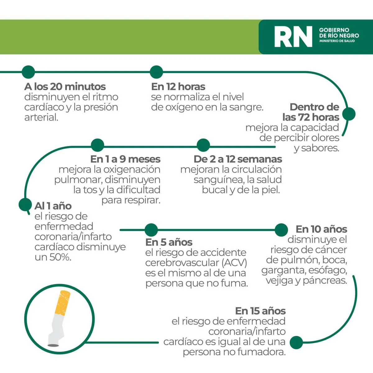 Es fundamental concientizar sobre los efectos nocivos del humo de tabaco para evitar el comienzo del hábito en los no fumadores e informar sobre los beneficios de dejar de fumar para estimular el abandono en los fumadores, teniendo presente que existen tratamientos efectivos y que pueden solicitar orientación para dejar de fumar al Programa Provincial de Cesación Tabáquica comunicándose al whatsapp 2984146009.