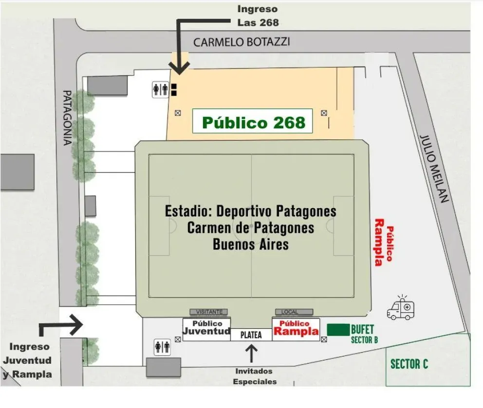 Para una mayor predisposición, el ingreso para Las 268 será por la calle Carmelo Botazzi y ocuparán la tribuna que habitualmente utiliza el público visitante en los partidos del Deportivo Patagones. La hinchada de Rampla ocupará la cabecera que da a espaldas al Cerro de la Caballada y el sector derecho de la tribuna local, teniendo ingreso por el portón principal de la calle Botazzi y Julio Meilán. Por otro lado, el público de Juventud, ingresará por la calle Patagonia y se colocará en el sector izquierdo de la tribuna local.