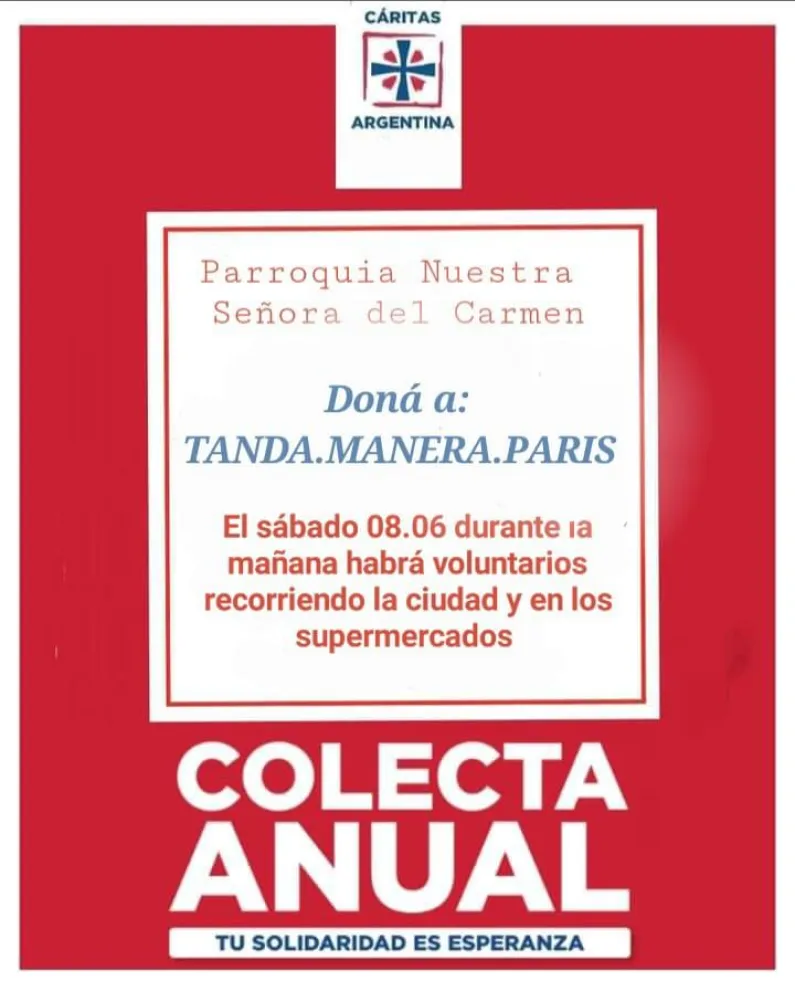 Con motivo de la colecta anual de Cáritas Argentina, bajo la consigna “Tu solidaridad es esperanza” este sábado 8 de junio durante la mañana habrá voluntarios recorriendo la ciudad de Carmen de Patagones y en los supermercados.