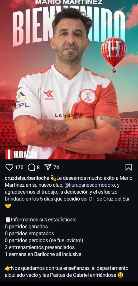 La particularidad de la publicación, es que desde el club rionegrino, acusan a Mario Martínez de marcharse tras cinco días ligado al club, y que se fue invicto, al no contabilizar derrotas en su haber, claro está, tampoco triunfos ni empates, ya que solo estuvo presente en dos entrenamientos con la institución.