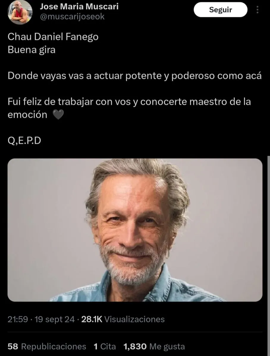 El director teatral José María Muscari fue uno de los primeros en despedirlo en las redes sociales: "Chau Daniel Fanego. Buena gira. Donde vayas vas a actuar potente y poderoso como acá. Fui feliz de trabajar con vos y conocerte maestro de la emoción".