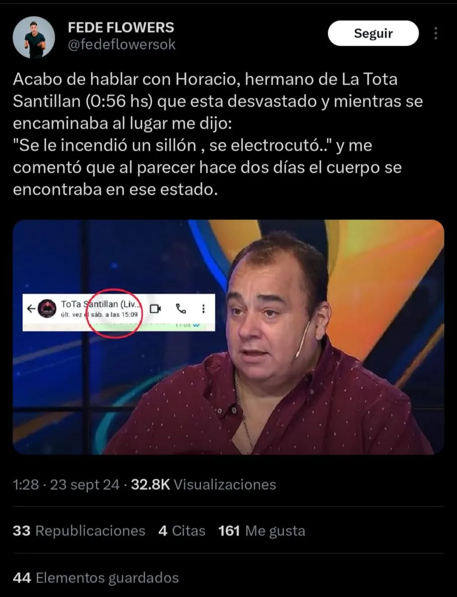 El periodista de espectáculo Fede Flowers compartió una conversación con Horacio, hermano de La Tota, quien expresó estar devastado y mencionó que “se le incendió un sillón y se electrocutó”.
