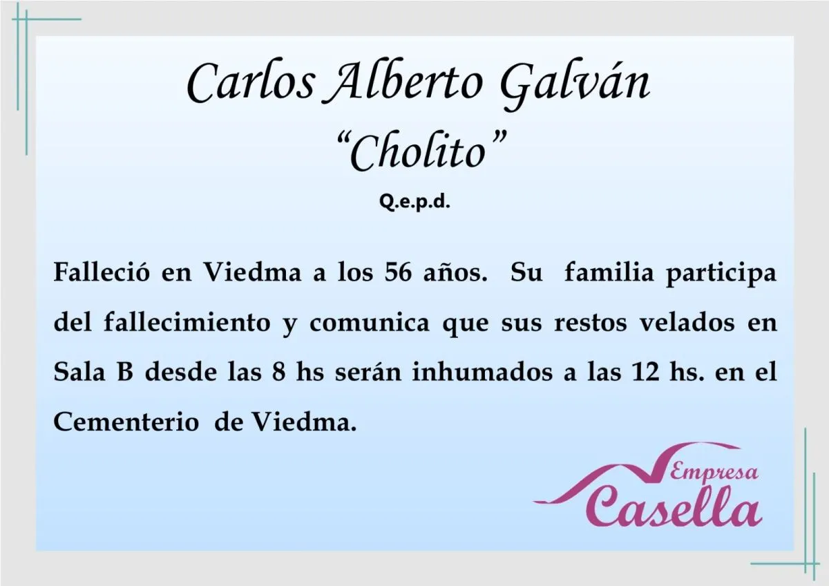 Ante su irreparable pérdida, la comunidad de la Comarca sufre una profunda consternación y acompañan a su familia en este doloroso momento. Sus restos serán velados en la Sala “B” de la casa velatoria Casella, desde las 8 y serán inhumados a las 12 en el Cementerio de Viedma.