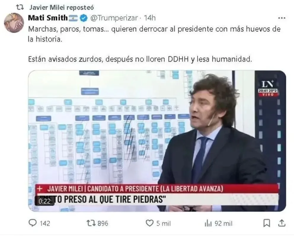 El retuit de Javier Milei que generó la denuncia de la máxima autoridad de la UNCo.