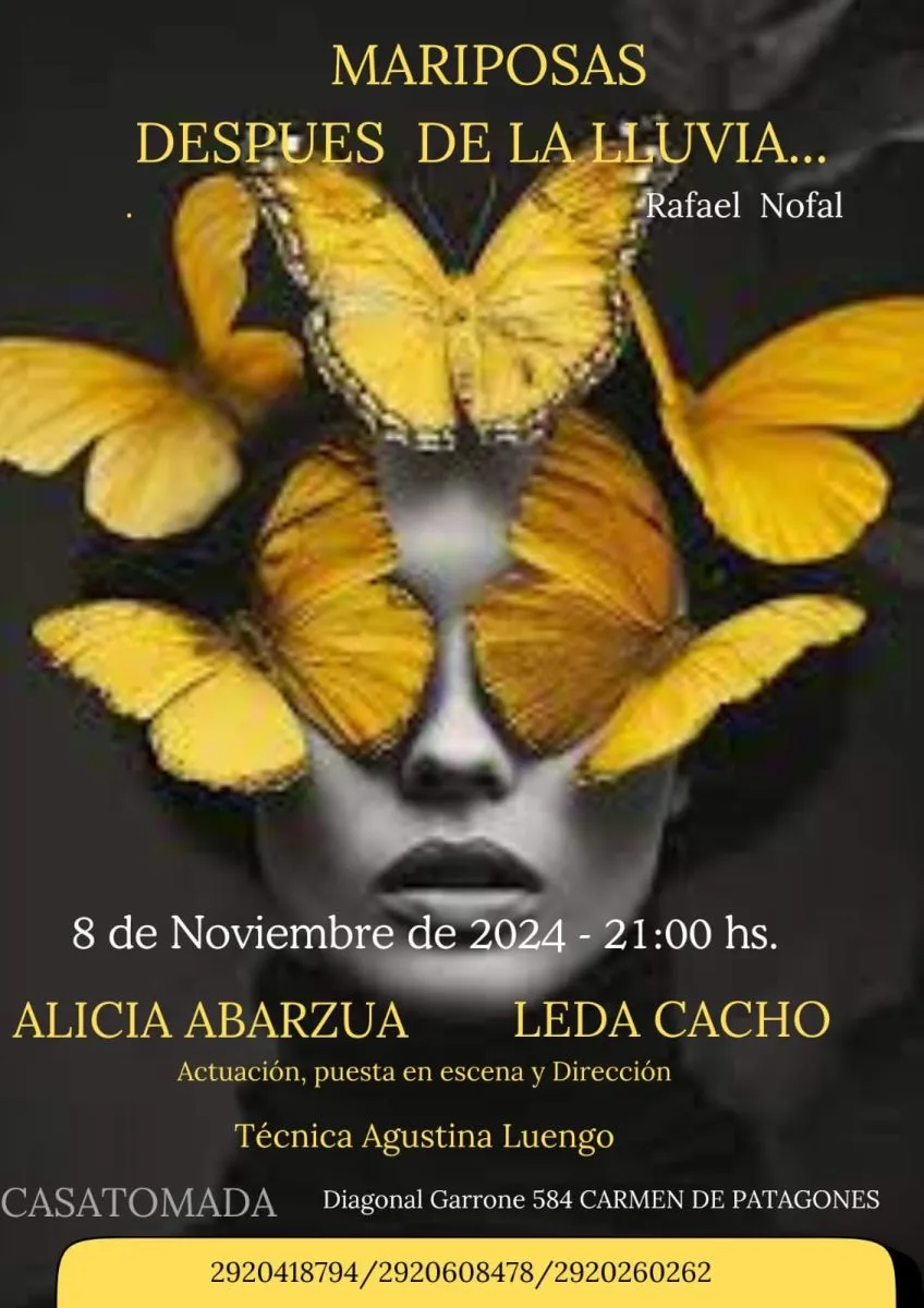 CasaTomada será el escenario de presentación de la obra “Mariposas después de la lluvia”, una creación del dramaturgo Rafael Nofal, que cuenta con la dirección y actuación de Alicia Abarzúa y Leda Cacho. La obra cuenta con la técnica de Agustina Luengo prometiendo una experiencia teatral única. Subirán al escenario mañana a las 21 en Garrone 584 de Patagones.