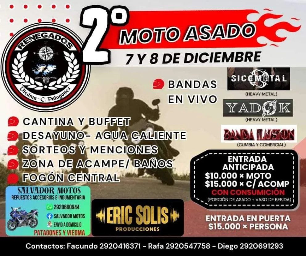 En la oportunidad también serán parte del show los grupos Sicometal y Banda Ilusión. El Moto Asado se realiza en la zona del IDEVI.