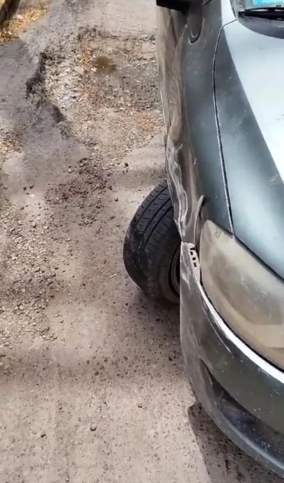 Esta acción terminó de la peor manera posible: la conductora termina en un pozo de dimensiones importantes que le destroza el tren delantero de manera inmediata.