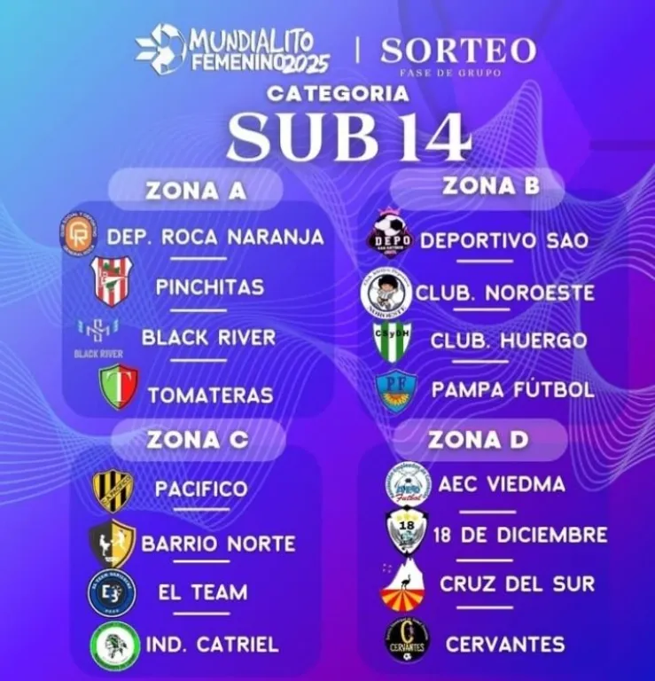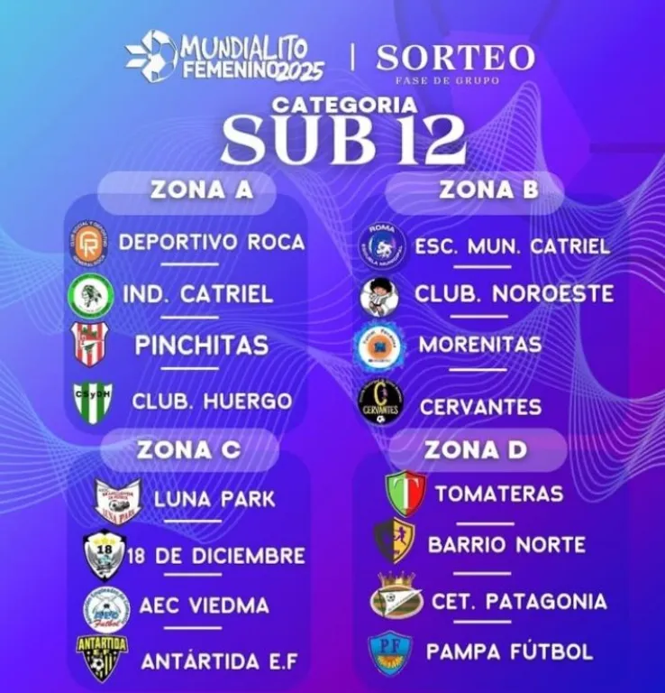 Sub 12 estará Deportivo Roca, Pinchitas, Pampa Fútbol, AEC Fútbol, club Noroeste, Roma Escuela, Municipal, Independiente de Catriel, Antártida E.F, 18 de diciembre, Barrio Norte, Tomateras, Luna Park, club Huergo, Morenitas, Cervantes y Ac Fc cet Patagonia.