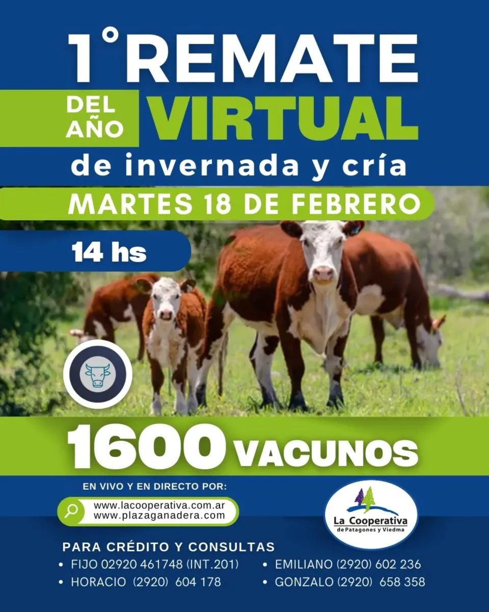 Los interesados en participar del remate virtual pueden hacerlo a través de la página de www.lacooperativa.com.ar, www.plazaganadera.com. Para créditos y consultar se pueden comunicar al teléfono fijo 02920 461748 (interno 201), horacio al 02920-604178, Emiliano al 02920-602236.
