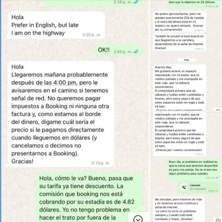 Y siguió: “Vi que esta persona era de Rumania y por eso le pregunté el idioma de su preferencia. Me preguntó si podíamos arreglar por fuera de la plataforma porque estaban cortos de dinero y no querían pagar comisión a la plataforma y que podríamos cancelar en el establecimiento o ponerle ‘no show’.