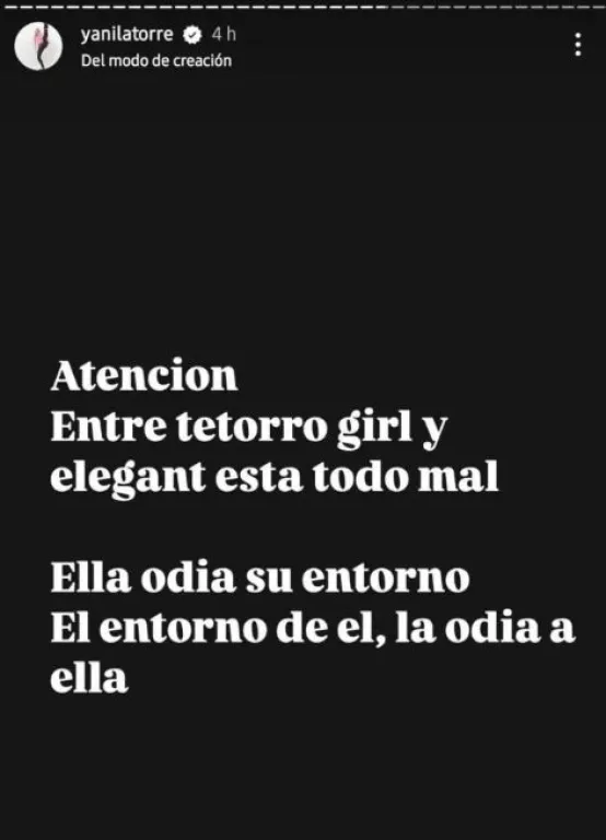 A pesar de intentar resolver las cosas y compartir un evento juntos el viernes, el vínculo entre ellos solo se ha deteriorado. Yanina explicó que ambos entornos se odian mutuamente: "Ella odia a su entorno. El entorno de él la odia a ella", afirmó.