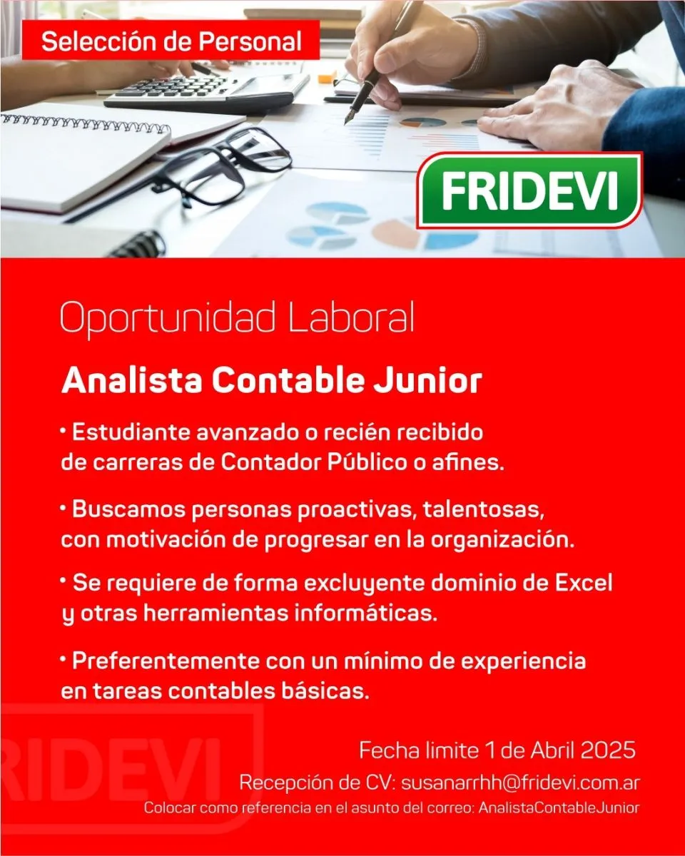 La empresa local Fridevi abrió la convocatoria para incorporarse a su equipo contable, destinado a jovenes vinculados al área contable.