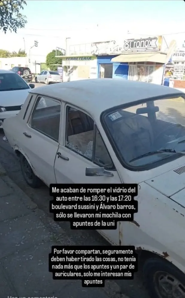 En sus redes sociales, el joven en cuestión, contó: “Me acaban de romper el vidrio del auto entre las 16.30 y 17.20 en boulevard Sussini y Álvaro Barros. Solo se llevaron apuntes de la uni”.
