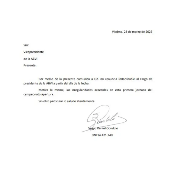 “Por medio de la presente comunico a Ud. mi renuncia indeclinable al cargo de presidente de la ABVI a partir del día de la fecha. Motiva la misma, las irregularidades acaecidas en esta primera jornada del campeonato apertura. Sin otro particular lo saludo atentamente” explica el comunicado que fue firmado por puño y letra del contador.