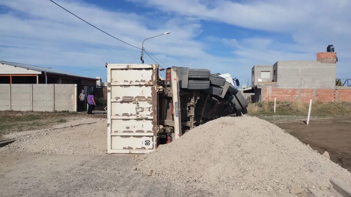 El conductor de un camión con carga hizo una mala maniobra y volcó su acoplado en la calle Los Alisos, en el barrio Jardín II de Viedma.