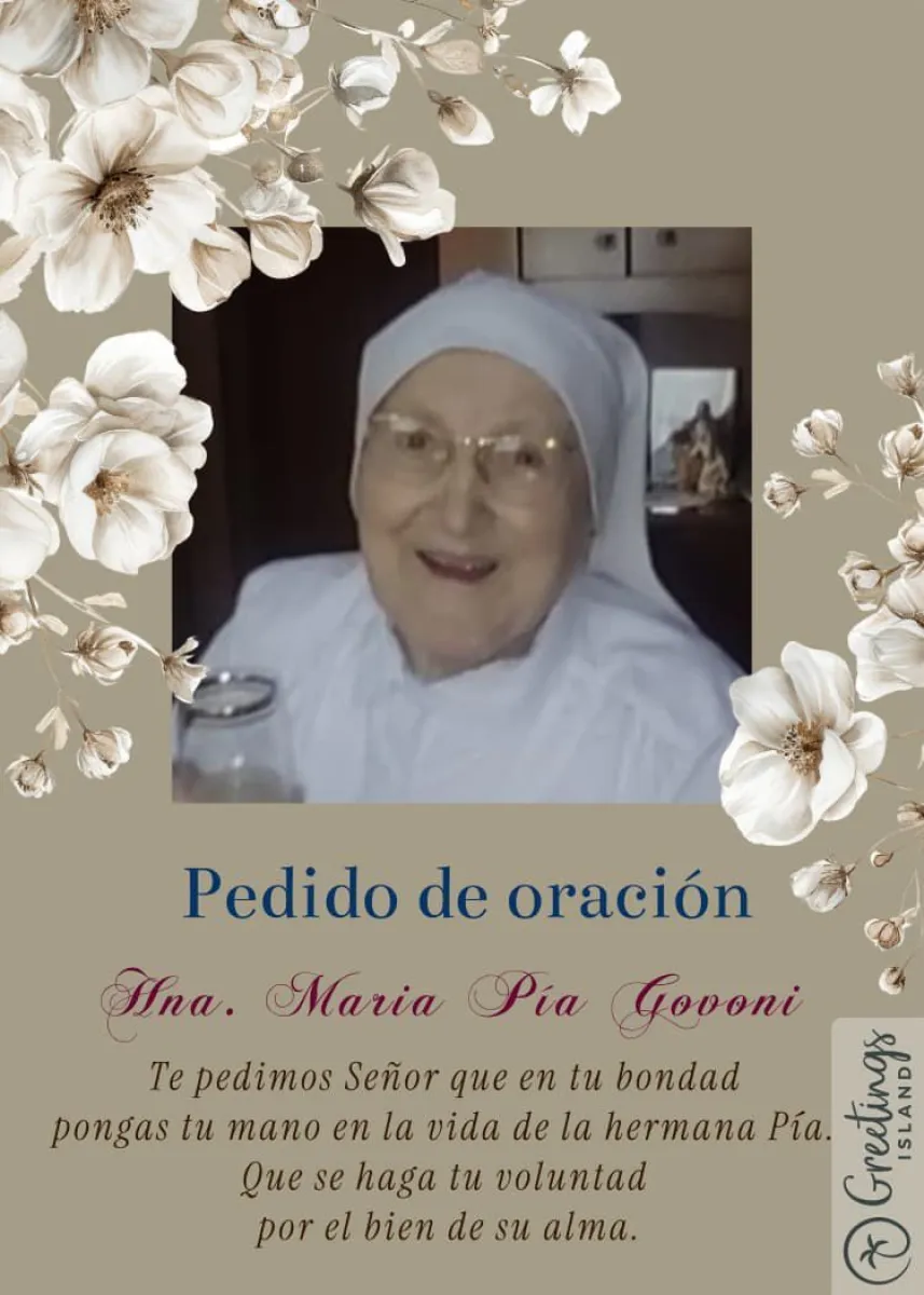 La comunidad católica de Carmen de Patagones se encuentra en estado de alerta y profunda preocupación ante la grave situación de salud que atraviesa la hermana Pía, quien fue intervenida quirúrgicamente de emergencia el martes último. Con 85 años de edad, la hermana Pía se encuentra actualmente en terapia intensiva, bajo respiración asistida, y su pronóstico es reservado.