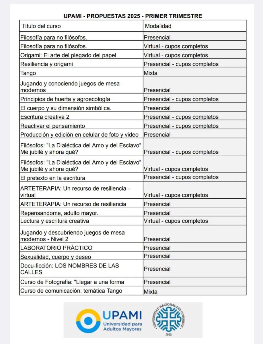 “Como todos los años, los talleres tienen mucha repercusión y un impacto muy positivo en la comunidad”, explicó Ain Luna, coordinadora de UPAMI-CURZAS. Este año se dictan 21 talleres en total, de los cuales 17 ya comenzaron con cupos completos desde la semana pasada. Las 4 propuestas que siguen abiertas invitan a explorar temáticas diversas desde una mirada activa, reflexiva y creativa sobre esta etapa de la vida.