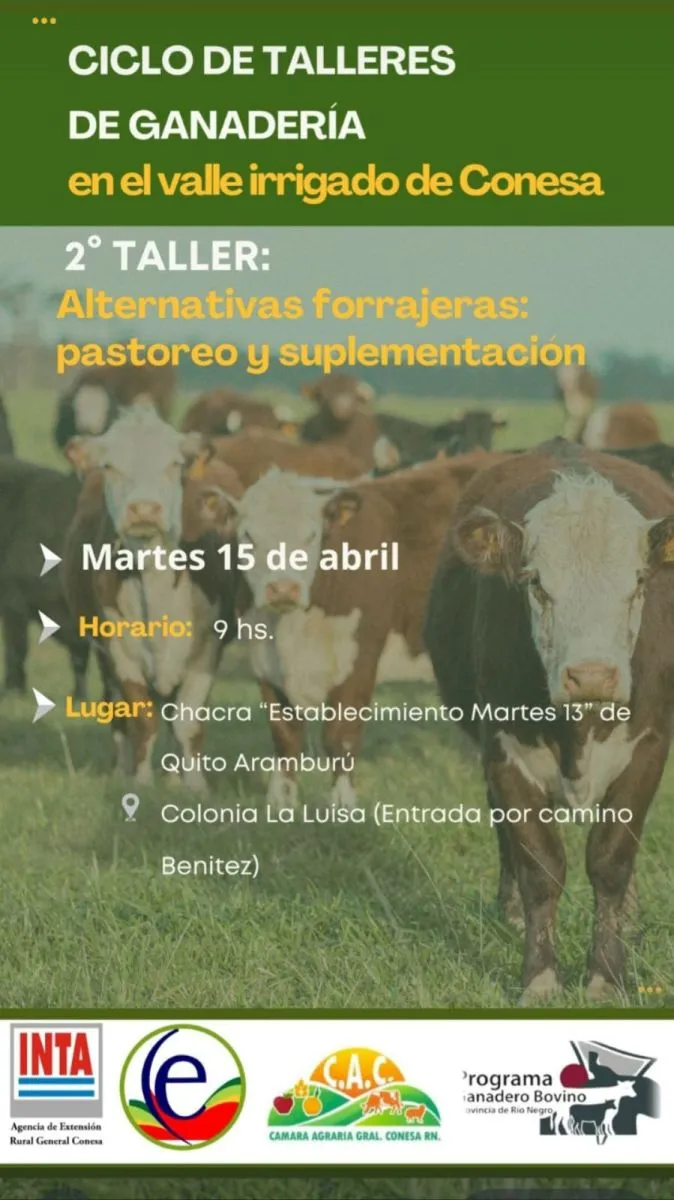 El próximo martes 15 de abril se llevará a cabo el 2° taller de ganadería en el valle irrigado de Conesa, en una jornada a campo en la que se abordarán “alternativas forrajeras: pastoreo y suplementación”. La actividad se realizará desde las 9 horas en la chacra de un productor en la Colonia La Luisa durante la mañana.