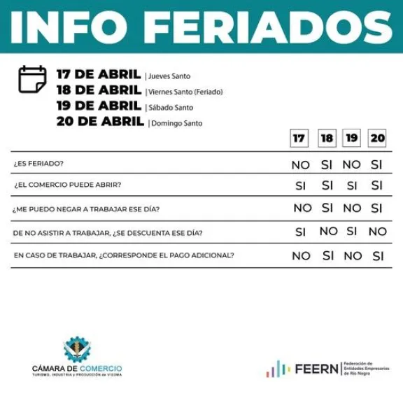 Ante esto, desde la Cámara de Comercio, Turismo, Industria y Producción de Viedma, brindaron un panorama con el propósito de que los empleados tengan en cuenta las jornadas que vendrán. El informe fue a través de preguntas concretas, para que no queden dudas.