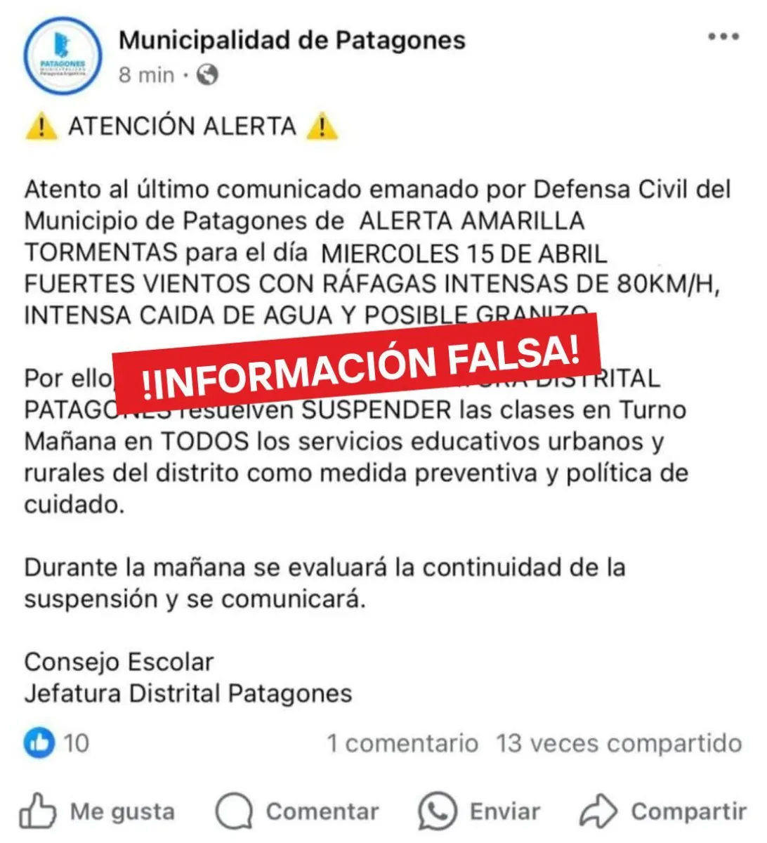 La Municipalidad de Patagones alerta por una noticia falsa sobre suspensión de clases