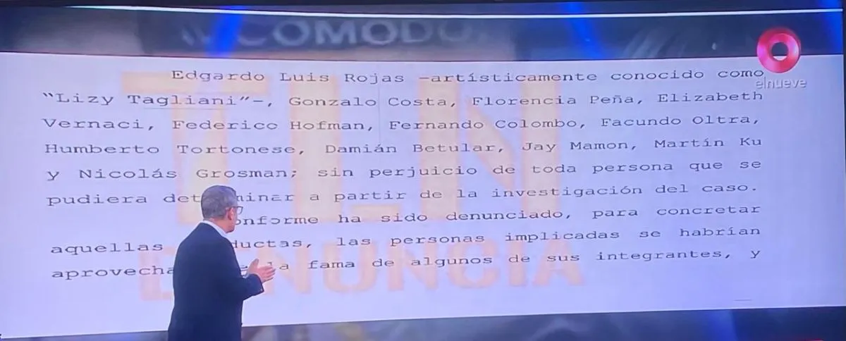 En cuanto a los presuntos nombres, se puede leer: “Edgardo Luis Rojas -artísticamente conocido como Lizy Tagliani-, Gonzalo Costa, Florencia Peña, Elizabeth Vernaci, Federico Hofman, Fernando Colombo, Facundo Oltra, Humberto Tortonese, Damián Betular, Jey Mammón, Martín Ku y Nicolás Grosman, sin perjuicio de toda persona que se pudiera determinar a partir de la investigación del caso”.