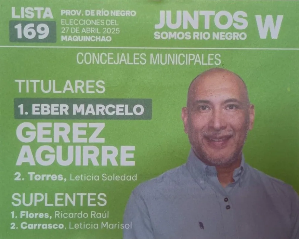 Por un lado, estará la propuesta de la lista 169, de Juntos Somos Río Negro, con Eber Marcelo Gerez Aguirre y Leticia Soledad Torres como candidatos, y Ricardo Raúl Flores y Leticia Marisol Carrasco como suplentes.
