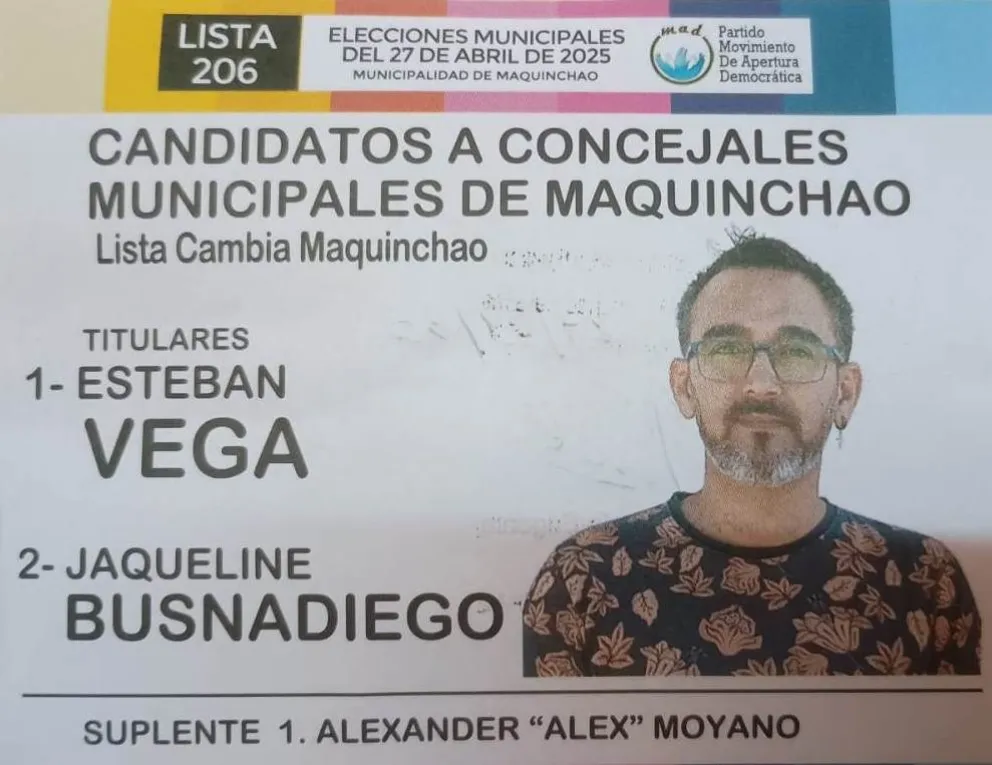 Por otra parte, la boleta 206, del partido Movimiento de Apertura Democrática (MAD), lleva a los candidatos Esteban Vega y Jaqueline Busnadiego, con Alexander Moyano como suplente. Esta opción es respaldada por la actual intendenta, Silvana Pérez.