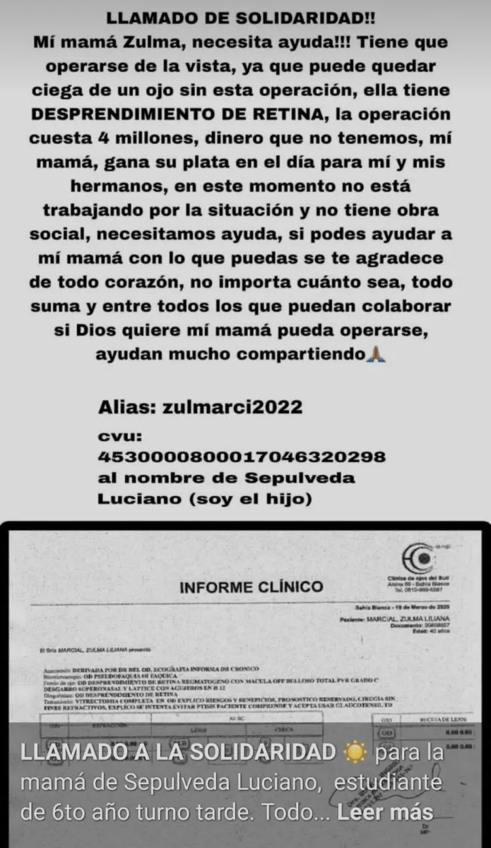 “Todo suma, no importa cuánto sea. Si pueden ayudar o compartir, ya es muchísimo. Dios quiera que con la ayuda de toda mi mamá pueda operarse”, escribió en su mensaje, que ya se compartió por todo Río Negro.