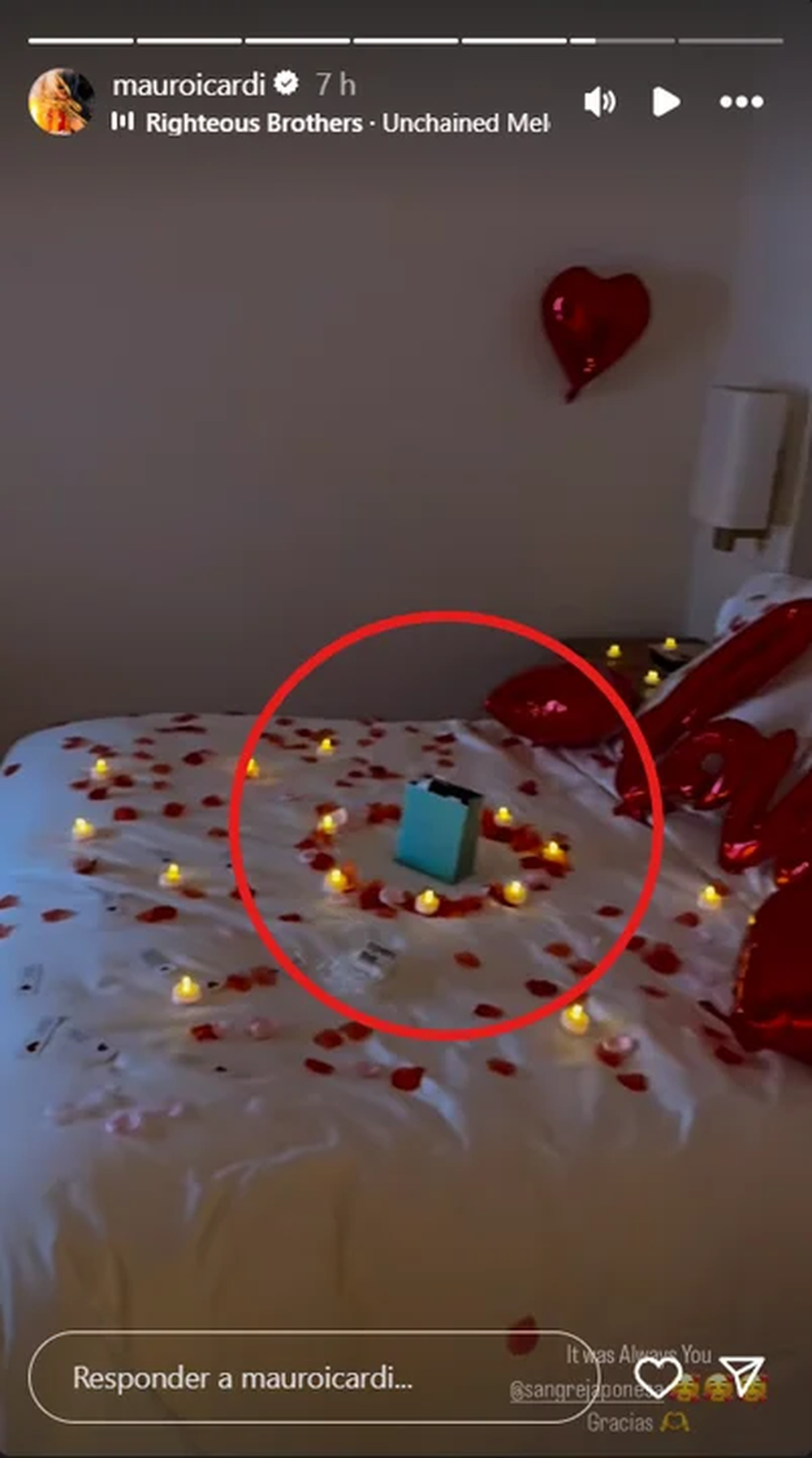 Sin embargo, hubo un detalle que encendió aún más los rumores. Sobre la cama, entre los pétalos, apareció una pequeña bolsa celeste, del tono exacto que caracteriza a la joyería Tiffany & Co. El envoltorio, colocado estratégicamente en medio de la ambientación, dio lugar a una sola pregunta: ¿hubo propuesta de casamiento?