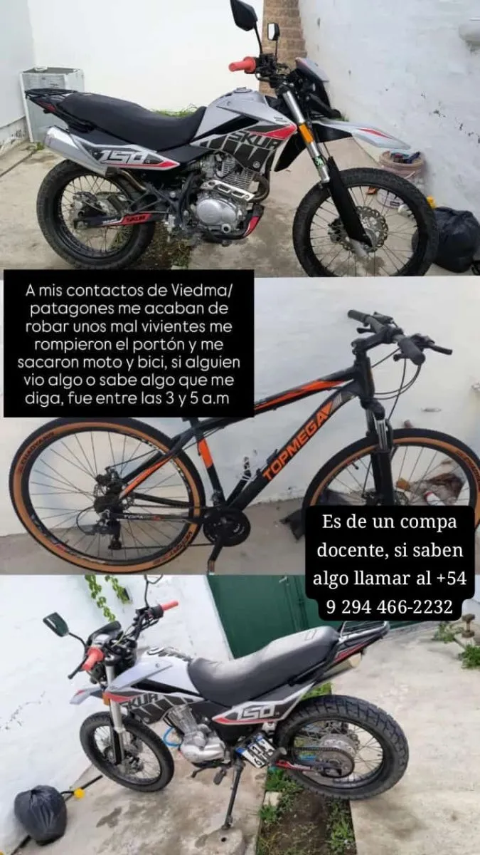 “Es lo que más me interesa recuperar porque es lo que yo uso para trabajar. La bici, si se puede recuperar, mejor… pero el tema es la moto, que encima no sé cómo la habrán arrancado, porque estaba trabada y sin la llave”, remarcó.