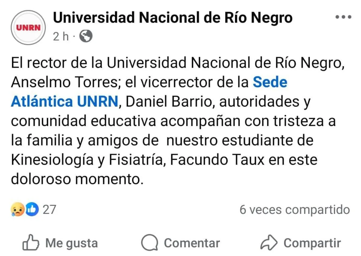 Se trata de Facundo Taux, quien era un chubutense de 20 años que estaba estudiante en la carrera de Kinesiología y Fisiatría de la Sede Atlántica.