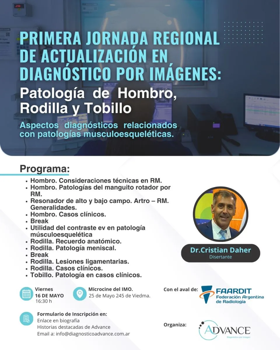 El capacitador será el médico especialista en diagnóstico por imágenes, Dr. Cristian Daher y cuenta con el aval de la Federación Argentina de Radiología (FAARDIT). Tiene como propósito exponer sobre aspectos diagnósticos relacionados con patologías musculoesqueléticas, brindando información y las últimas novedades en diagnóstico, considerando la mirada del experto desde su experiencia clínica e investigativa.