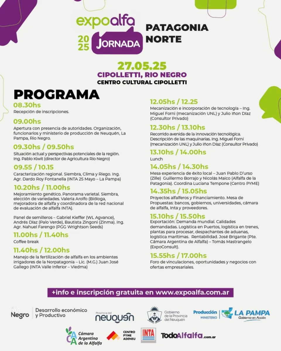 El 27 de mayo, en el Centro Cultural Cipolletti, la jornada ExpoAlfa invitan a debatir sobre la “calidad de la alfalfa”. Disertaciones, muestra estática, avenida de innovaciones, Ronda de Oportunidades, Vinculaciones y Negocios, y más. Organizan TodoAlfalfa, Gobierno de Rio Negro, Neuquén y La Pampa, junto al Centro PyME ADENEU, el INTA y la Cámara Argentina de Alfalfa.