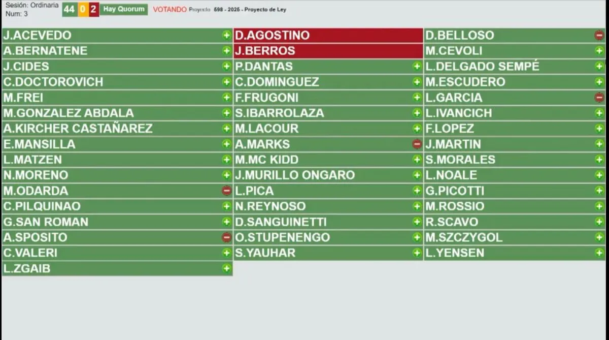 Cerca de las 14:30 horas, la norma fue aprobada y sancionada por mayoría con 39 votos positivos y 5 negativos. Solamente votaron en contra los legisladores peronistas Magdalena Odarda, Ayelén Spósito, Ana Marks, Daniel Belloso y Leandro García.