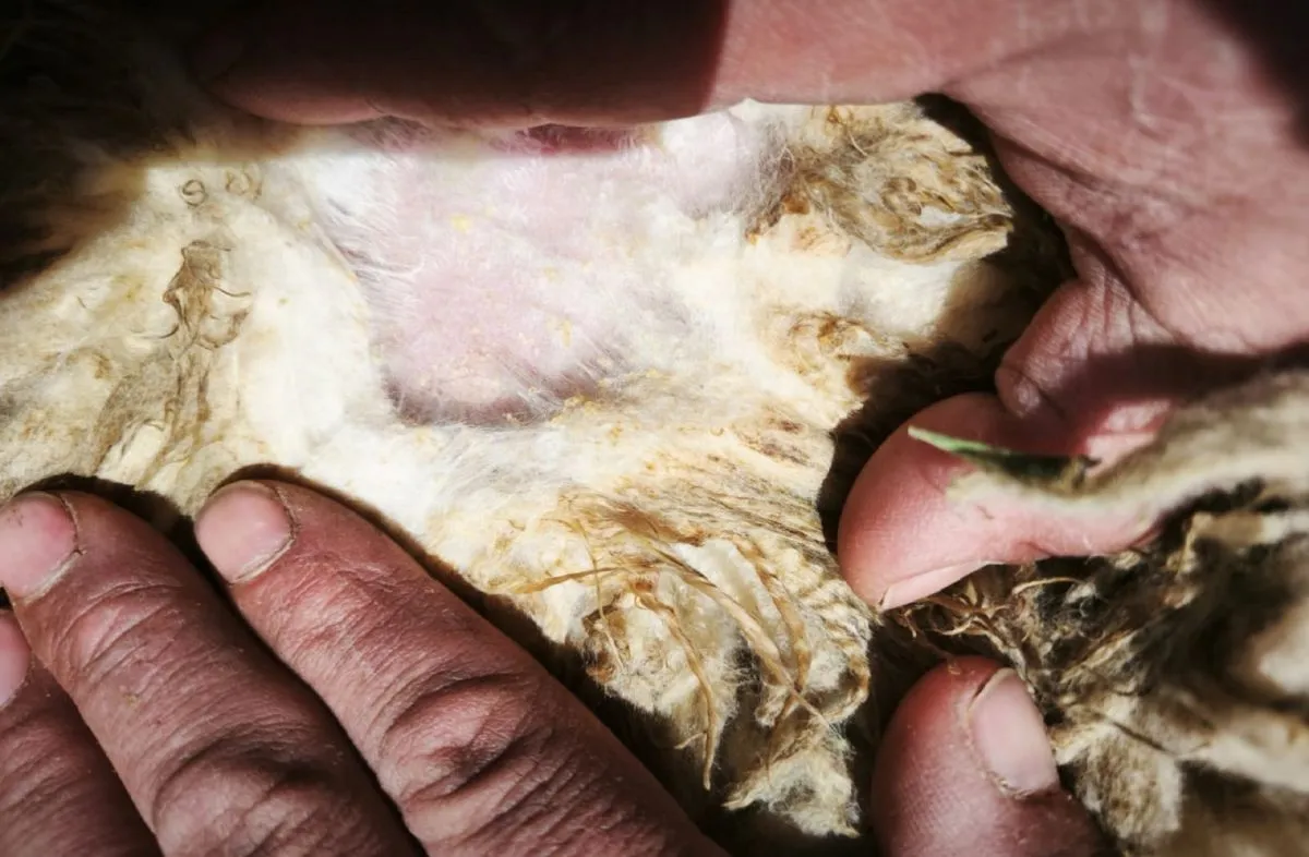 Al tacto y en caso de infestación, se podrá detectar el “granito”, una vesícula producida por los ácaros que genera una coloración de la piel verdosa azulada. En caso de lesiones más avanzadas, se pueden presentar zonas sin lanas con costras amarillentas y piel “acartonada” en fosas nasales, en la zona perianal y en espacios interdigitales.