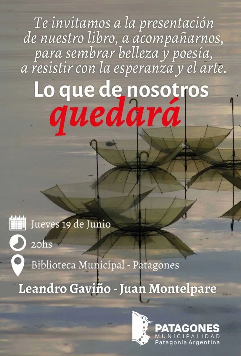Este jueves 19 de junio a las 19:30 horas, la Biblioteca Municipal de Carmen de Patagones será escenario de un encuentro singular entre la poesía y la imagen. El escritor Leandro Gaviño y el artista Juan Pablo Montelpare presentarán “Lo que de nosotros quedará”, un libro-arte que nace como un gesto de memoria y ternura, y que invita al público a un recorrido íntimo por la vida cotidiana desde la sensibilidad del arte.