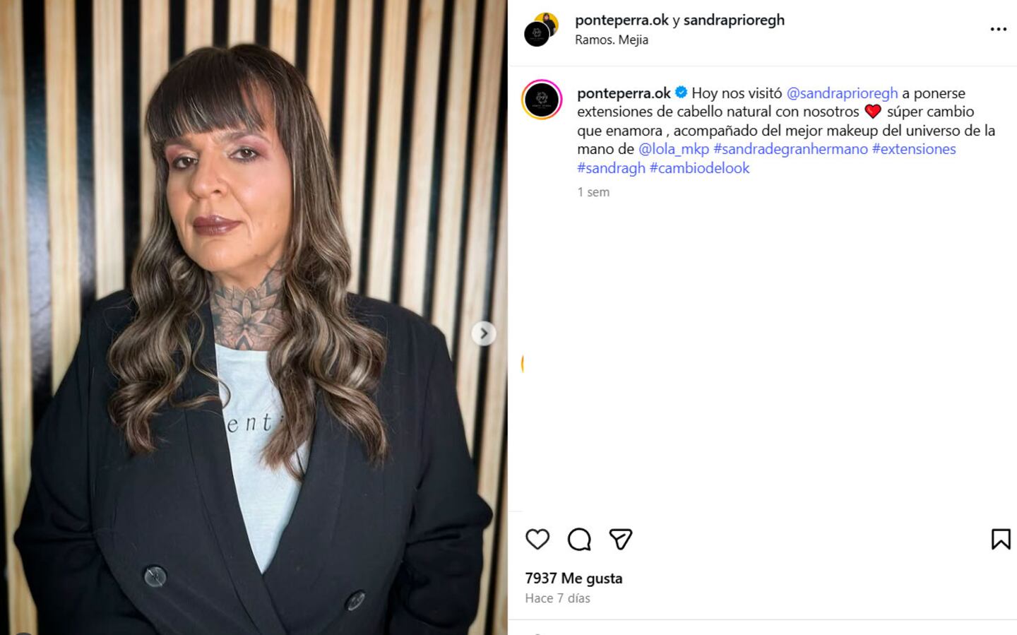 La transformación no terminó ahí, Sandra deseaba un aspecto innovador también para su cabello. Decidió rejuvenecer su melena con un color chocolate y extensiones naturales que le confieren una longitud y volumen sobresalientes. Este servicio, que ella obtuvo a través de un acuerdo promocional, deja ver el ingenio comercial que los ex participantes desarrollan al salir del show. La nueva imagen de Sandra ha dividido opiniones entre sus seguidores, suscitando tanto comentarios de admiración como críticas.