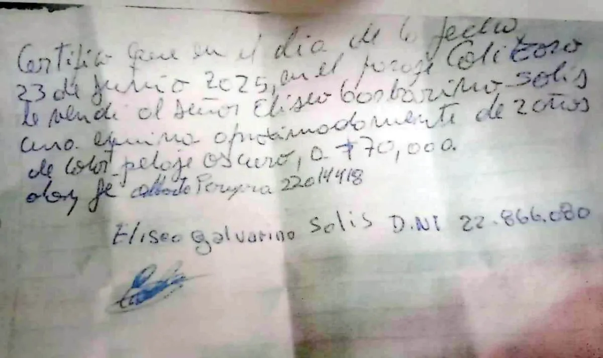 En su carta, Eliseo cuenta que la sequía, los altos costos del forraje y la falta de infraestructura como mataderos habilitados hacen que, en zonas rurales, la faena de potros sea una práctica común en esta época del año. Lejos de un negocio ilícito, explica que el animal en cuestión fue comprado legalmente a un vecino —de quien adjuntó el recibo—, con la idea de vender parte de esa carne para comprar alimentos y forraje para sus animales.