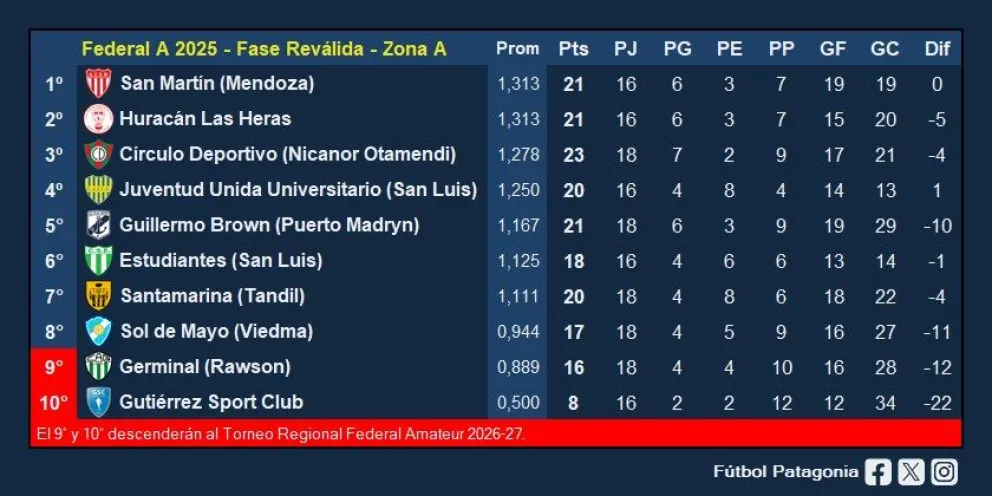 Los dos peores descenderán al Regional Amateur, y hoy, antes de comenzar la etapa, Sol no estaría perdiendo la categoría, es que se ubica octavo de diez equipos, por encima de Germinal de Rawson y Gutiérrez de Mendoza.