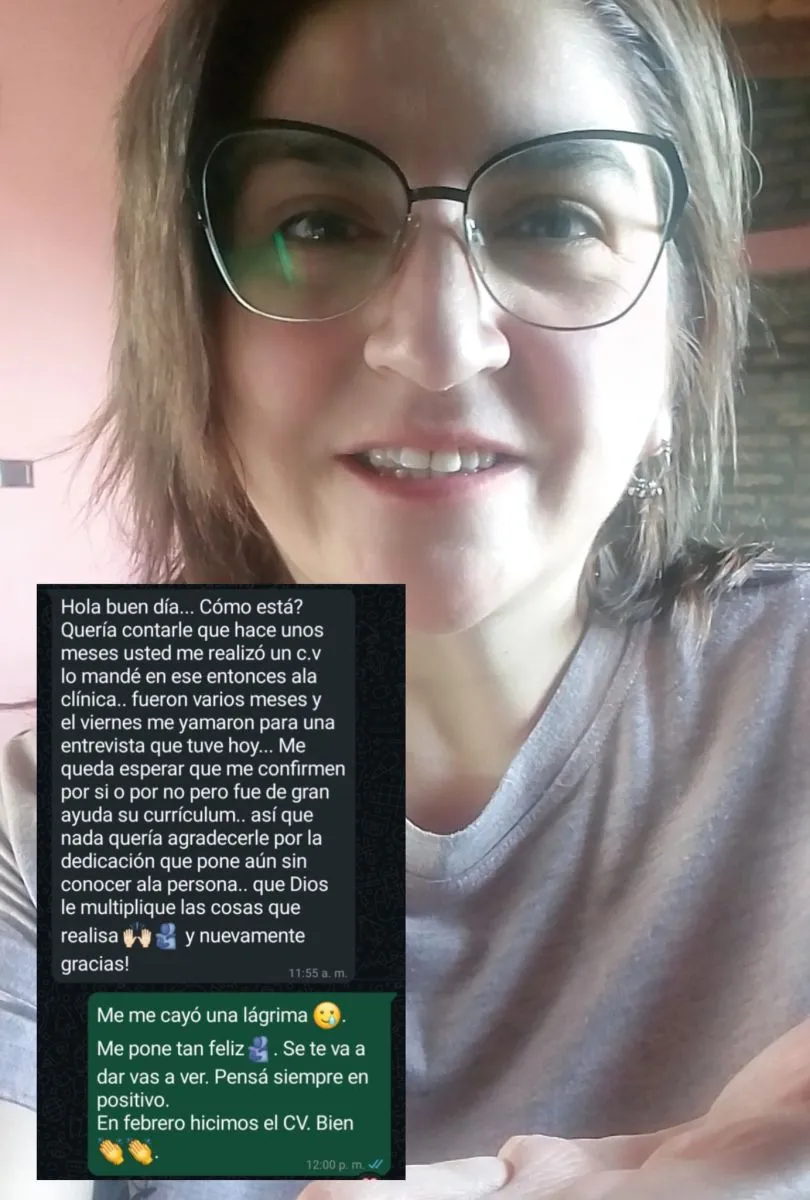 “Una vez una tía me pidió acompañamiento para armar el CV de sus tres sobrinos. Muchas veces me escriben mamás desesperadas por ayudar a sus hijos, o esposas que me mandan los datos de sus maridos para que yo les arme el currículum. A veces no quieren ni que ellos se enteren al principio, y terminamos acompañando en familia. Se arman pequeñas redes de contención desde un simple mensaje”, cuenta.