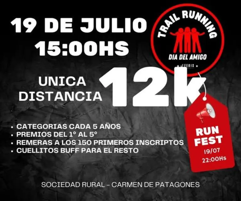 Se aproxima un acontecimiento importante, y en la antesala se disputará la tercera edición del Trail “Día del Amigo”, con una propuesta de 12 kilómetros (única distancia) en el predio contiguo a la Sociedad Rural de Patagones, donde se concentrarán cerca de 300 deportistas de la Comarca y visitas de Neuquén, La Pampa, Bahía Blanca.